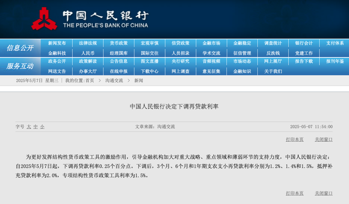 中国人民银行5月7日发布消息称,为更好发挥结构性货币政策工具的激励作用,引导金融机构加大对重大战略、重点领域和薄弱环节的支持力度,中国人民银行决定:自2025年5月7日起,下调再贷款利率0.25个百分点。此举旨在优化金融市场环境,促进经济平稳发展。