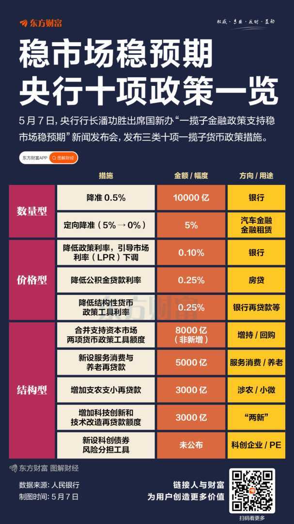 5月7日,国务院新闻办公室召开新闻发布会,介绍“一揽子金融政策支持稳市场稳预期”有关情况。中国人民银行行长潘功胜在会上介绍,将推出三类举措共十项具体政策支持稳市场稳预期。这些政策预计至少释放2.1万亿元的长期资金支持,旨在稳定市场预期。
