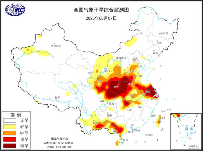 中央气象台5月7日18时继续发布气象干旱黄色预警:据实时气象干旱监测,陕西、河南、江苏、广西等省区存在重旱,其中,陕西南部、河南西部、湖北西北部、江苏南部等地特旱。预计,未来3天,西南地区东部、江南、华南大部地区将先后迎来大到暴雨,江淮、江汉大部也将有中到大雨,特别是江苏南部等地,或将遭遇暴雨或大暴雨,这对缓和当前的气象干旱形势十分有利。然而,对于其余旱区来说,由于降雨稀少,气象干旱或将持续甚至加剧。