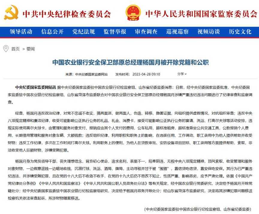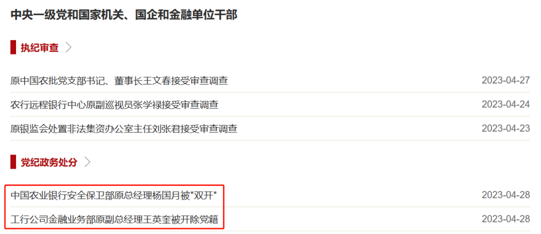 4月28日,中央纪委国家监委网站发布消息,中国工商银行公司金融业务部原副总经理王英奎和中国农业银行安全保卫部原总经理杨国月因严重违纪违法被给予党纪政务处分。