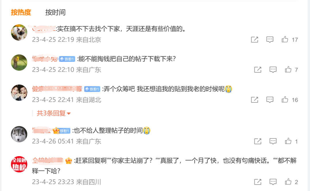 尽管如此,天涯社区的官方微博仍在持续更新。然而,网友们在其发布的微博下纷纷留言,表达了各种情绪:“能不能给点时间,把自己的帖子下载下来”,“你家都没了,还发微博呢”,“你家主站崩了?”,“真服了,快一个月了,也没有一句明确的回应”,“都不解释一下?”