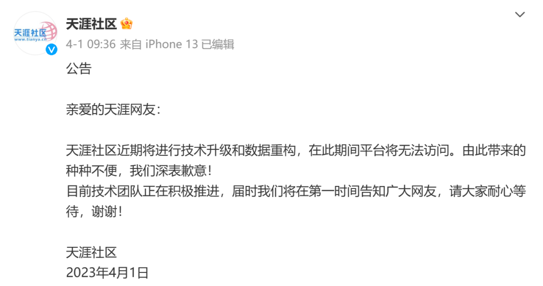 值得注意的是,天涯社区官方微博曾在4月1日发布公告,称平台将进行技术升级和数据重构,期间将暂时无法访问,并呼吁大家耐心等待。
