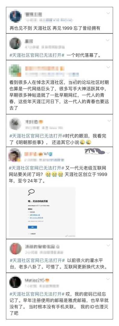 天涯社区无法正常访问的消息传出后,网友们在社交平台上掀起了一股“悼念潮”,纷纷感慨:“天涯关了,咫尺天涯,永不再见。”