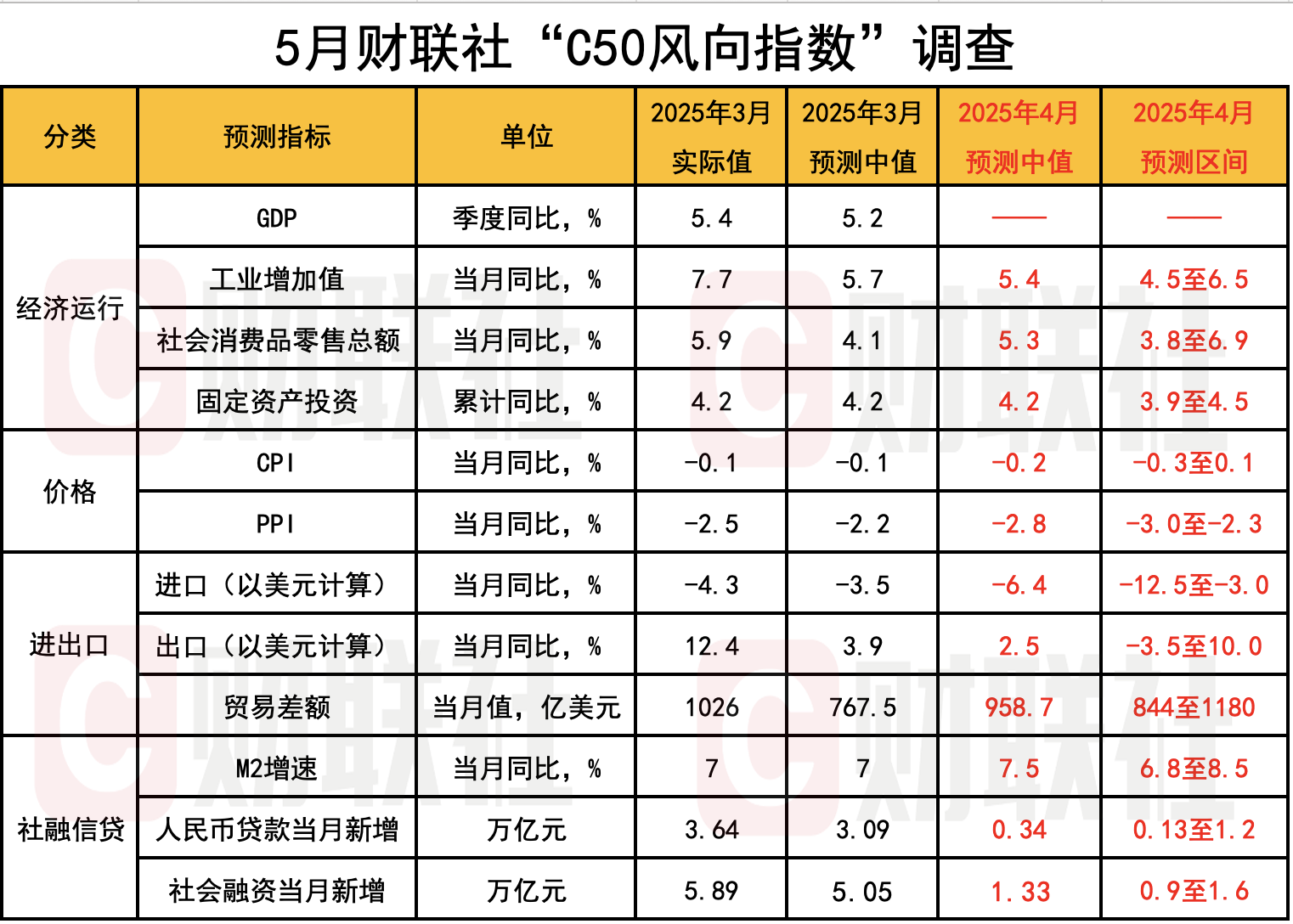 新一期财联社“C50风向指数”显示,4月社融增速预计明显回升,但新增贷款可能同比少增。同时,CPI增速或有下滑,PPI降幅或继续扩大。机构对4月经济数据进行了全面预测。