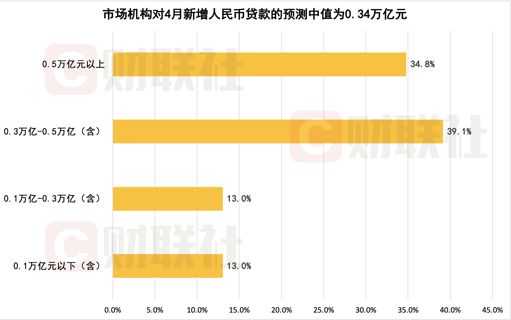 4月新增人民币贷款预测中值为0.34万亿元,或同比少增。3月新增3.64万亿元,同比多增5500亿元。机构预测区间为0.13万亿至1.2万亿元,较去年同期0.73万亿元少增3900亿元。