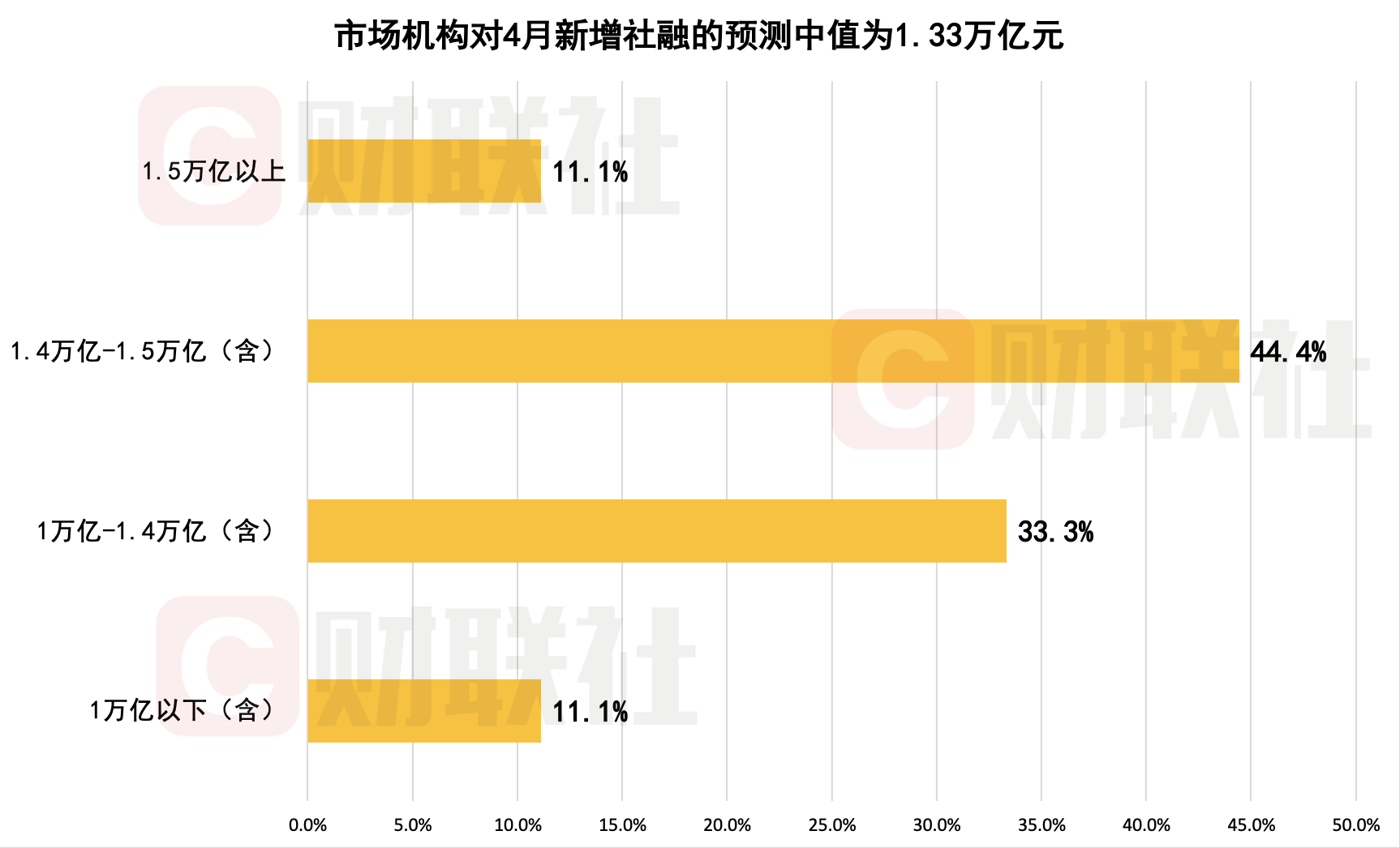 财联社5月8日讯(记者夏淑媛)新一期财联社“C50风向指数”出炉,市场预计4月社融增速显著回升,但新增贷款可能同比少增。其中,市场机构预测4月新增人民币贷款中值为0.34万亿元,对4月新增社融的预测中值则为1.33万亿元,同比多增1.5万亿元。同比低基数下,超6成机构预测4月末社融增速将超过8.8%。