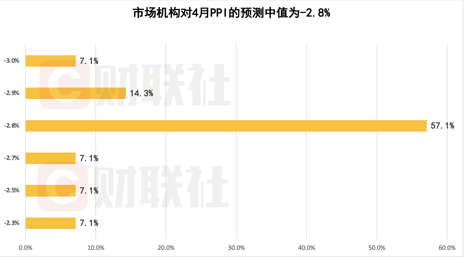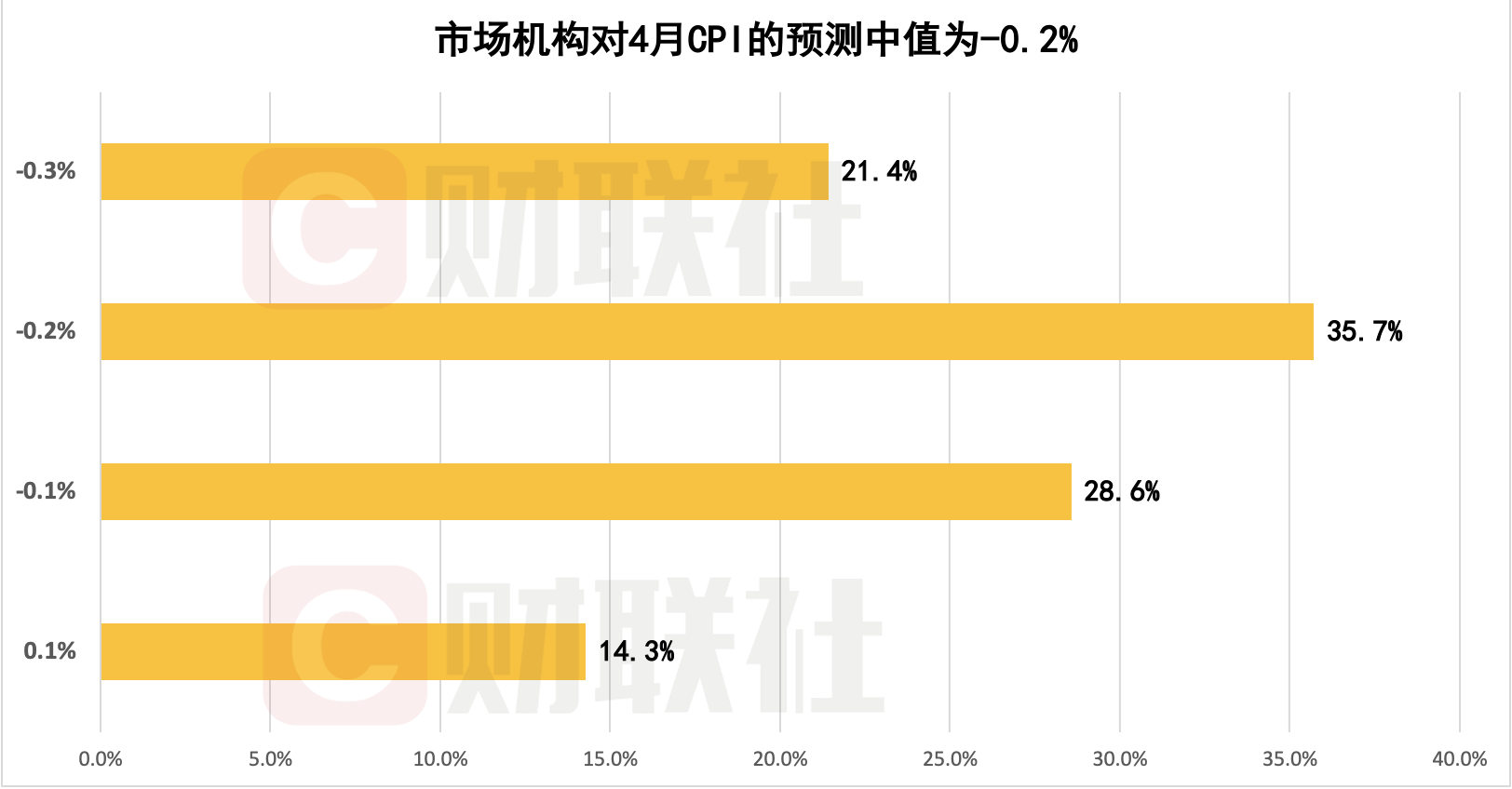 物价方面,市场预测4月CPI增速可能下滑,PPI降幅或继续扩大。同比读数显示,机构预测4月CPI同比增速中值为-0.2%,PPI同比增速中值则为-2.8%。