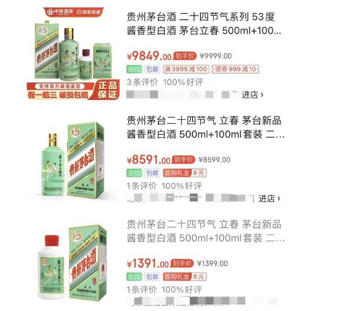 茅台节气酒从发布到市场流通需要时间,立春酒已批量入市,京东、淘宝等平台可购,整套价格超9000元。雨水酒在拍卖平台可见,近期500ml产品拍卖价超5万元。茅台节气酒限量发行,市场供应量稀少,价格暴涨。经销商表示,为了获得购买资格,用户需花费数千元购买合成材料,再加上购酒金,成本高昂。