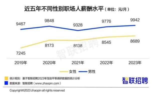 在薪酬方面,2023年女性的平均月薪为8689元,相较于男性的9942元,存在1253元的差距。然而,这一差距正逐年缩小。2019年,女性月薪比男性低23.5%,而到了2023年,这一差距已缩小至约12%。这一趋势表明,女性的职场价值正逐渐获得更多认可。