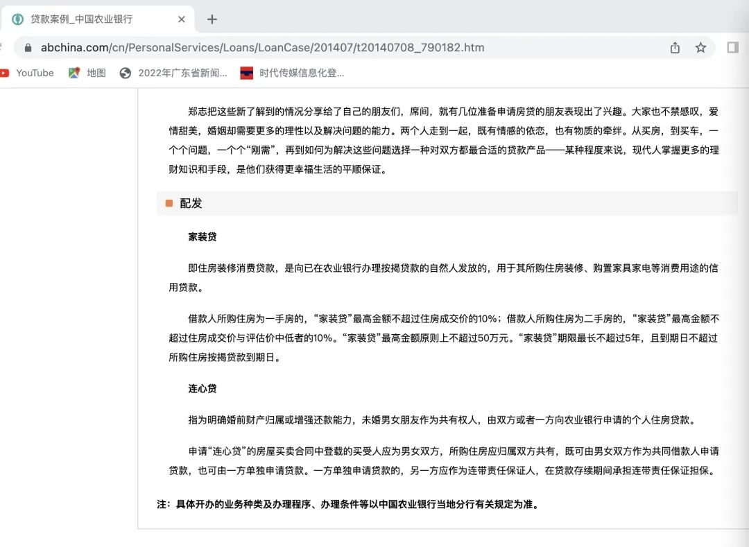 “连心贷”并非新鲜事物,农业银行官网早在2014年7月就发布了相关贷款案例。案例中提到,未婚男女朋友可以作为共有权人一起申请贷款,并作为新房的所有权人,使双方权利和义务更加平等明晰,缓解还款压力,减少日后可能产生的矛盾。