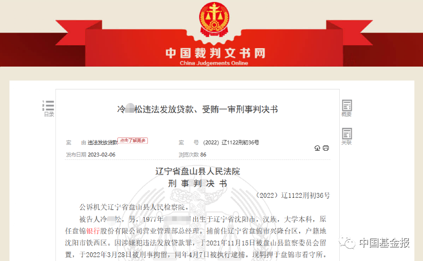 又有来自盘锦银行的银行干部冷某松,因违法发放贷款和受贿而遭遇牢狱之灾。日前,中国裁判文书网披露的一份刑事判决书揭示了这一案件。