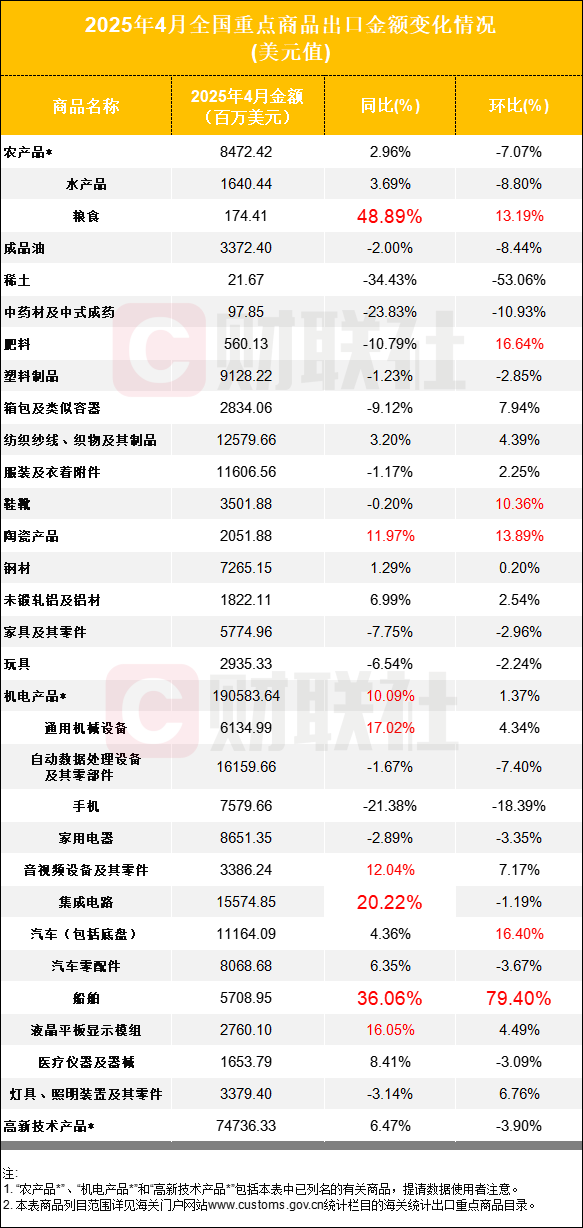 具体来看,集成电路4月出口金额同比增长20.22%,远超3月的7.88%,显示出强劲的增长势头。船舶4月出口金额同比增长36.06%,较3月的1.93%大幅提速,且4月环比增幅近八成,表现尤为亮眼。