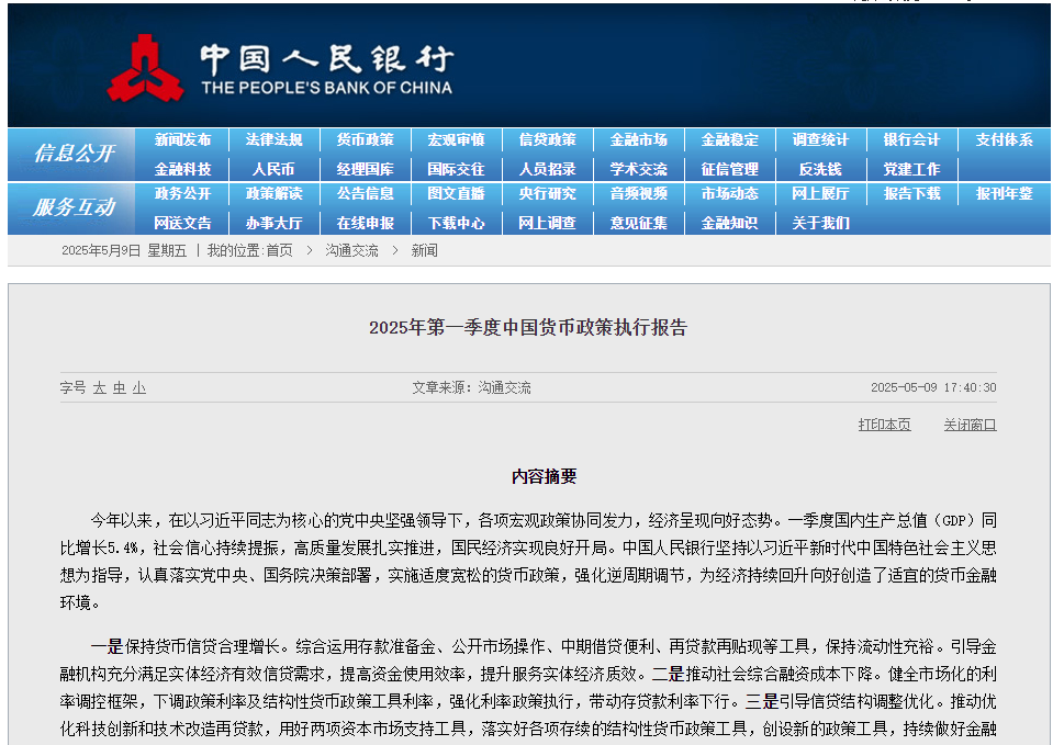 央行发布2025年第一季度货币政策执行报告,金融支持政策助力经济回升