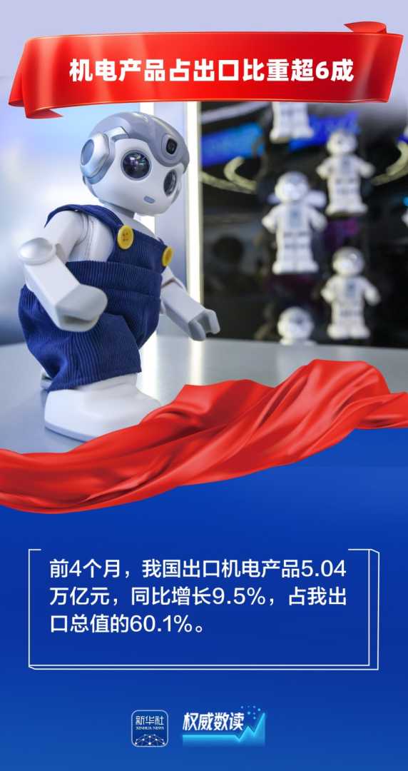 海关总署发布数据,今年前4个月我国货物贸易进出口总值达14.14万亿元,同比增长2.4%。其中,机电产品出口增长9.5%,占出口总值的60.1%,显示外贸经济平稳增长。