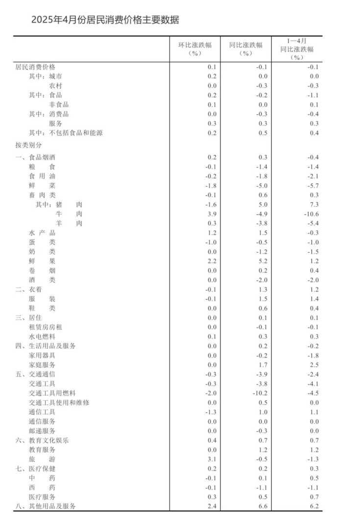 国家统计局:4月份居民消费价格同比下降0.1%,CPI环比由降转涨