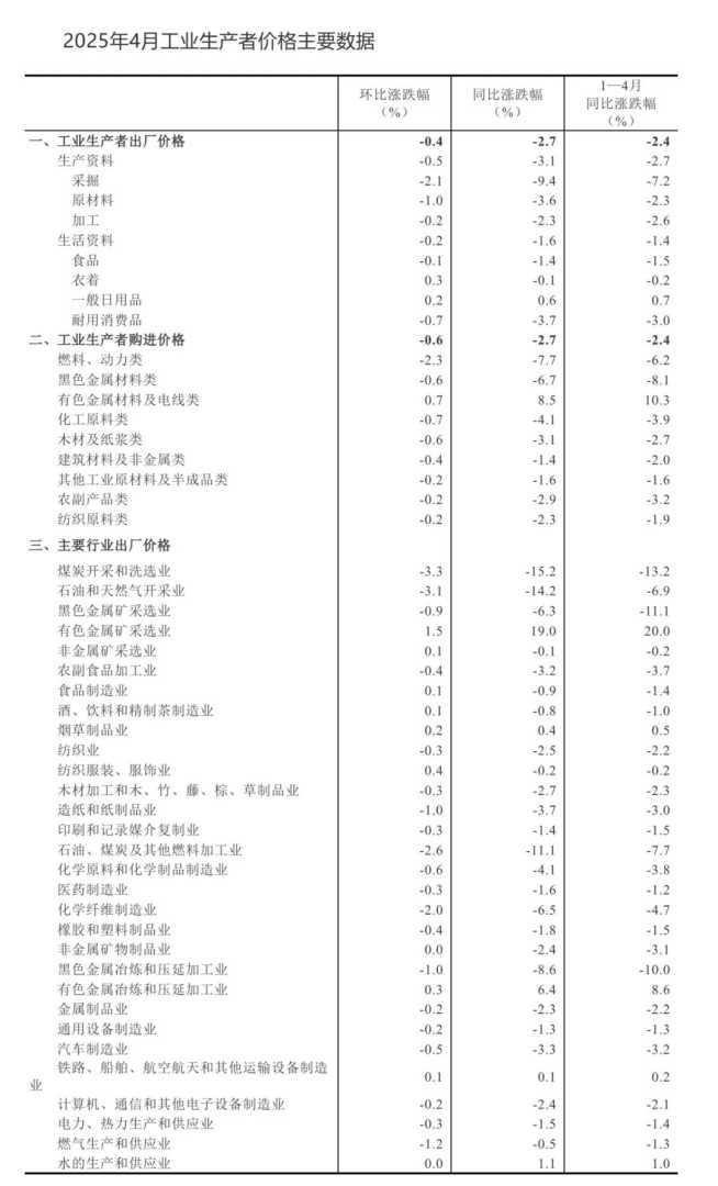 2025年4月,全国居民消费价格同比下降0.1%,CPI环比由降转涨,显示消费市场温和复苏。工业生产者出厂价格同比下降2.7%,环比下降0.4%。虽然国际输入性因素对部分行业价格产生下拉影响,但我国经济基础稳、韧性强,高质量发展扎实推进。