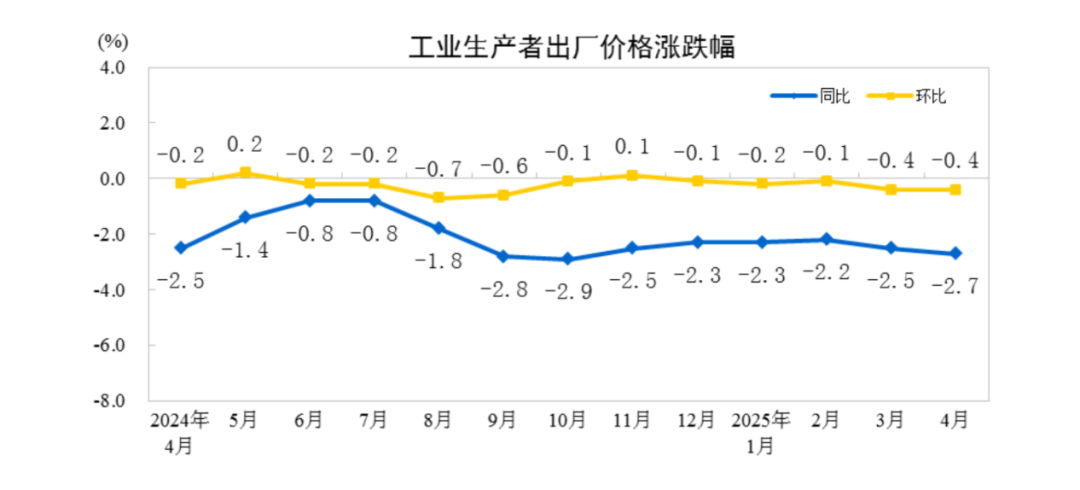 4月份,PPI环比下降0.4%,降幅与上月相同。