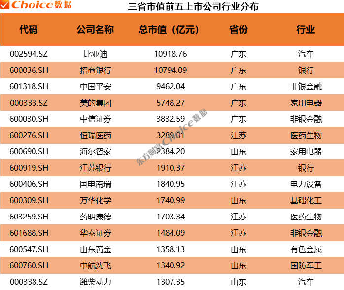 此外,三省的高市值上市公司也各具特色。广东拥有23家市值超过千亿元的A股上市公司,其中比亚迪、招商银行等知名企业位列其中。江苏和山东的高市值上市公司同样实力不俗。