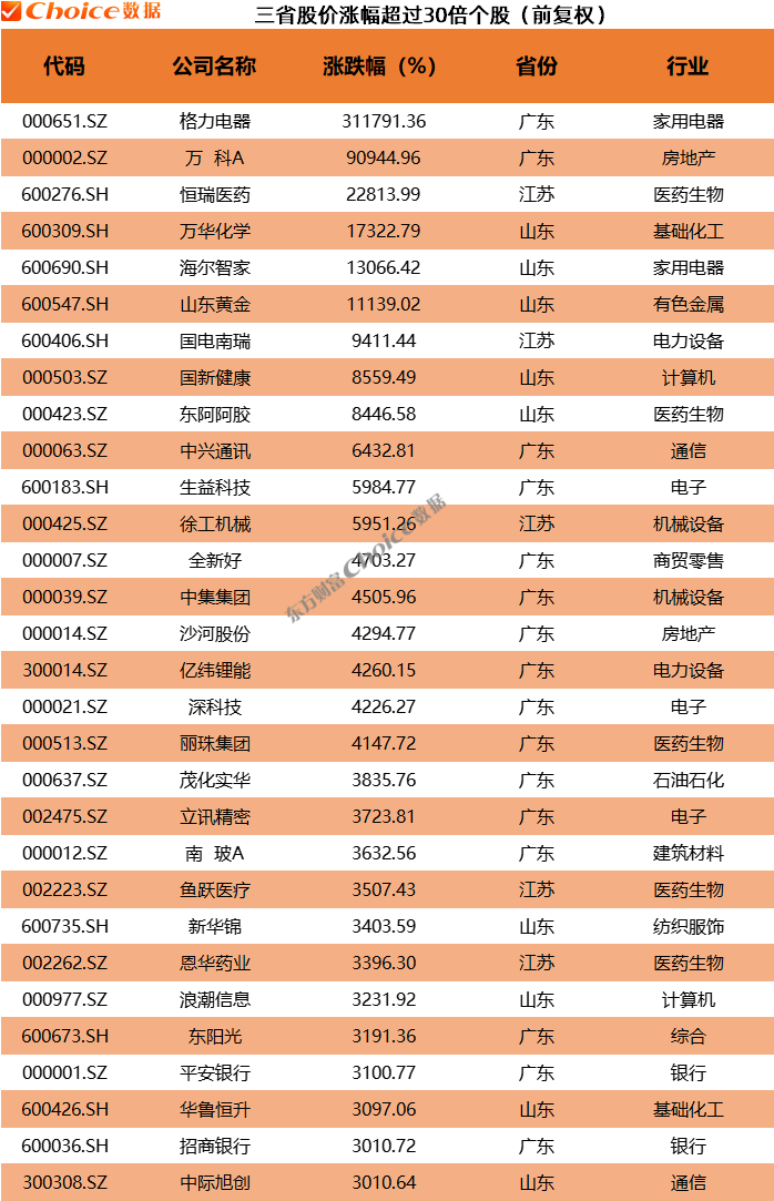 在股市表现方面,粤苏鲁三省的上市公司同样亮眼。截至5月11日,三省共诞生过多只高倍股,其中广东的格力电器更是创造了千倍股的奇迹。