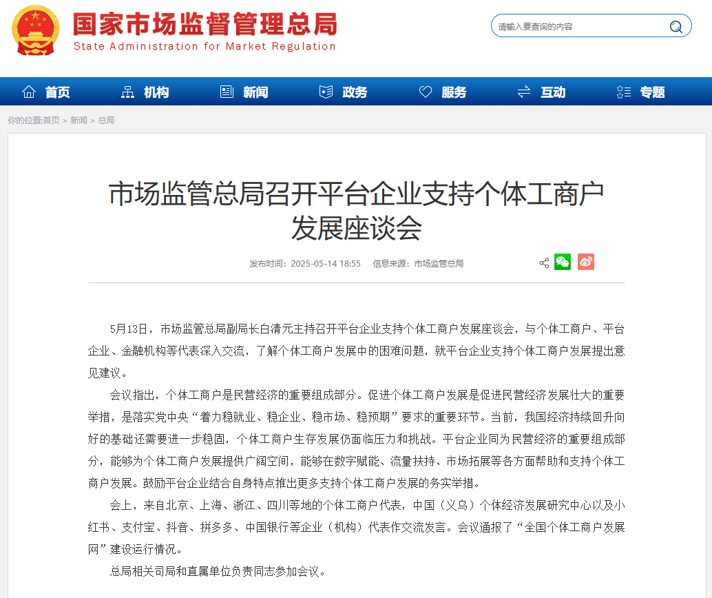 市场监管总局召开座谈会,探讨平台企业支持个体工商户发展
