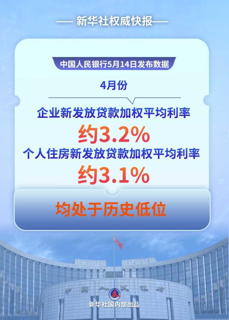 5月14日,中国人民银行发布的数据显示,4月份企业新发放贷款加权平均利率约为3.2%,相比上年同期下降了约50个基点,个人住房新发放贷款加权平均利率则约为3.1%,较上年同期低约55个基点,两项利率均处于历史低位。