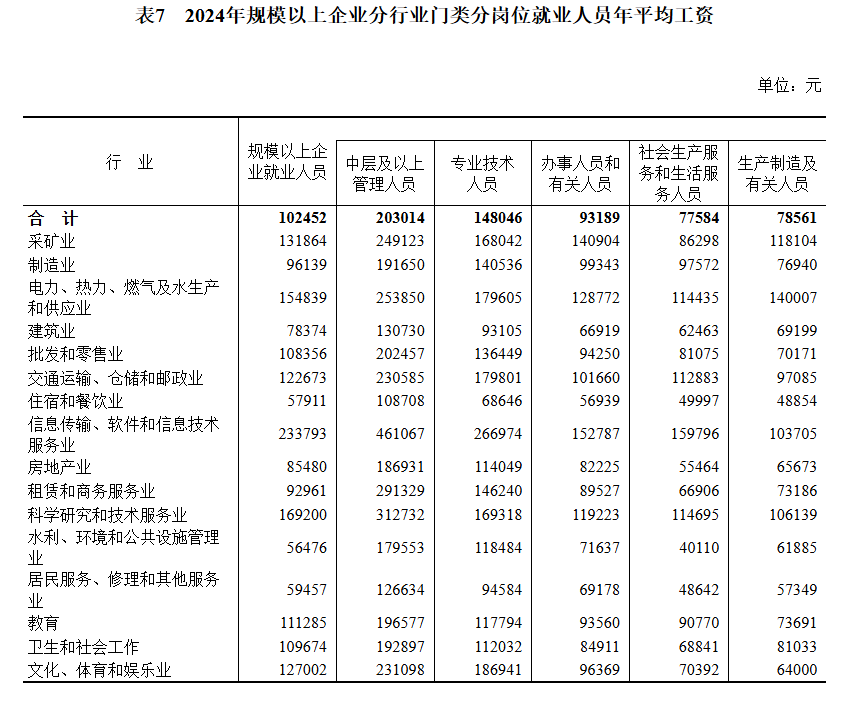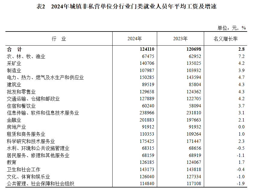 2024年全国城镇非私营单位和私营单位就业人员年平均工资分别为124110元和69476元,规模以上企业年平均工资为102452元。工资增长反映经济平稳运行,行业间工资水平位次总体稳定,规模以上企业岗位间差距缩小。