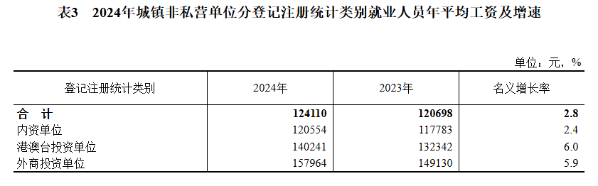 2024年,全国城镇非私营单位就业人员年平均工资124110元,比上年增加3412元,名义增长[1]2.8%,按可比口径[2]增长2.6%。