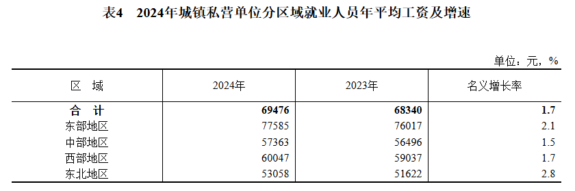 2024年,全国城镇私营单位就业人员年平均工资69476元,比上年增加1136元,名义增长1.7%,按可比口径增长4.0%。