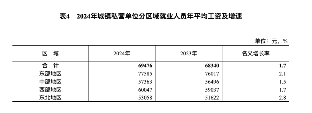 2024年,全国城镇私营单位就业人员年平均工资69476元,比上年增加1136元,名义增长1.7%,按可比口径增长4.0%。私营单位工资增长虽慢,但增速稳定。
