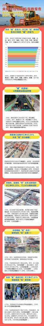 挖掘机是基础设施建设的“标配”,是反映基础设施建设、观察固定资产投资等经济变化的风向标。央视财经打造的“央视财经挖掘机指数”今日发布了最新相关数据。4月份,我国各项基建稳步推进,道路基建尤为火热,路面设备开工率维持高位,西部地区港口设备增长显著,港口设备开工率持续攀升。