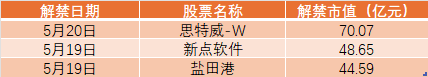 限售股解禁情况:Wind数据显示,本周A股市场将有38只股票面临解禁,合计解禁市值为307.80亿元。其中,思特威-W、新点软件、盐田港的解禁市值居前。
