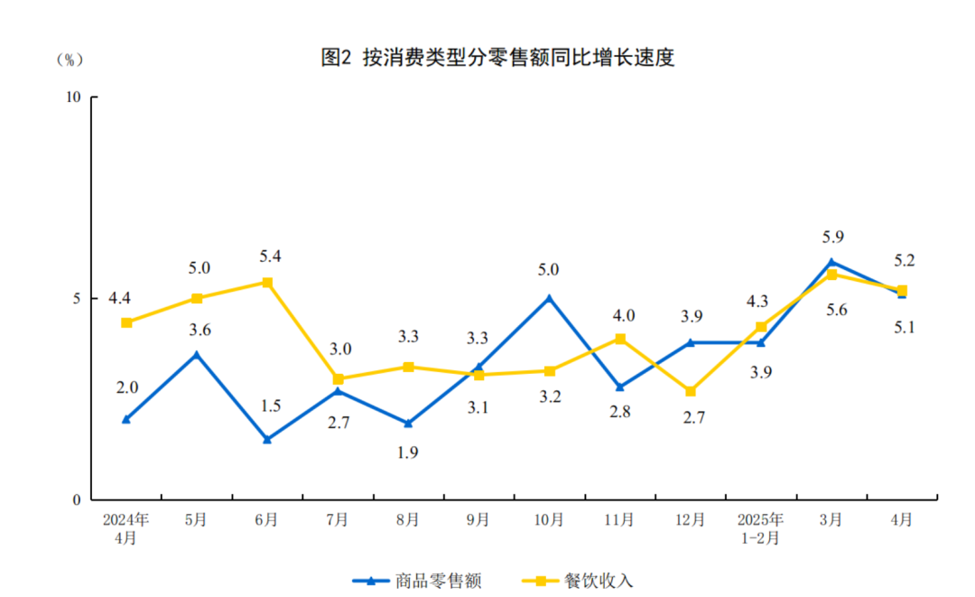 4月份社会消费品零售总额增长5.1%,消费市场需求持续回暖。
