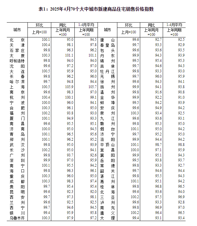4月各线城市商品住宅销售价格环比持平或略降,同比降幅收窄。