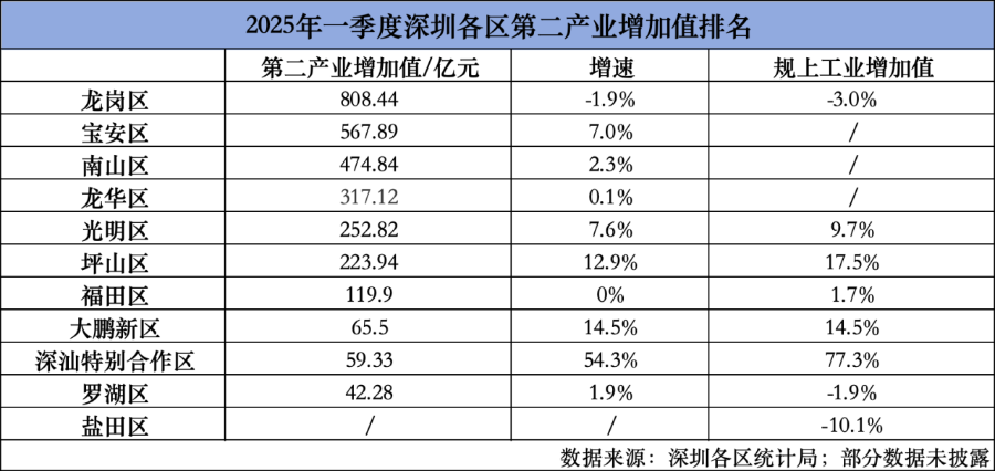 坪山区、大鹏新区、深汕特别合作区的第二产业增加值、规上工业增加值均实现两位数增长。龙岗区继续领跑,一季度第二产业增加值达到808.44亿元,占全市第二产业增加值的27%。宝安区以567.89亿元位列第二,南山区以474.84亿元位居第三。