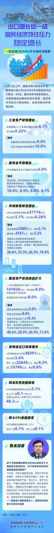 5月19日,国家统计局公布2025年4月份国民经济运行情况。面对外部冲击和内部挑战,国民经济保持稳定增长,延续向新向好发展态势。南都记者为你整理了一图读懂4月经济数据,带你快速了解国内经济最新动态。