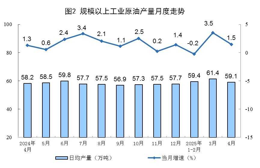 原油生产保持增长。4月份,规上工业原油产量1772万吨,同比增长1.5%,增速比3月份放缓2.0个百分点;日均产量59.1万吨。
