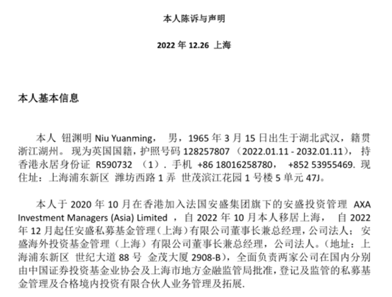 该份名为《本人陈述与声明》的文件中,钮渊明详细讲述了自己的遭遇。他目前为英国国籍,持香港永居身份证,于2020年加入法国安盛集团,即安盛私募基金的母公司,后于2022年移居上海。