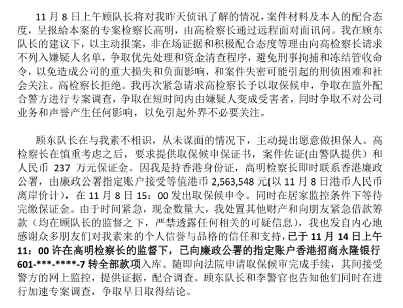 在后续的过程中,钮渊明在自称“专案检察长高明”“上海中级人民法院第二厅张海平大法官”等人的建议下,为了证明自己的清白并避免对公司业务和声誉造成影响,由“顾东队长”做担保人,申请了取保候审,并缴纳了1000万元保证金。