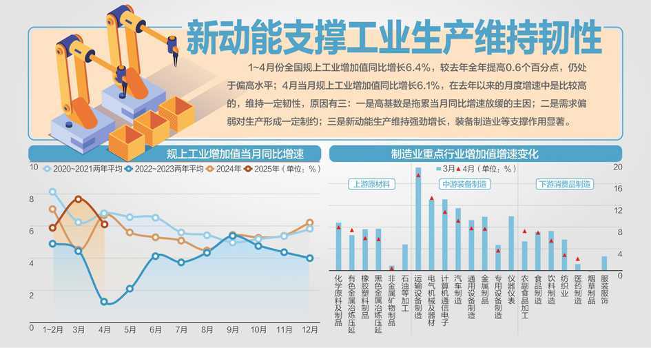 三是工业新动能持续增强。新能源、智能产品生产快速增长,成为推动工业生产的重要力量。
