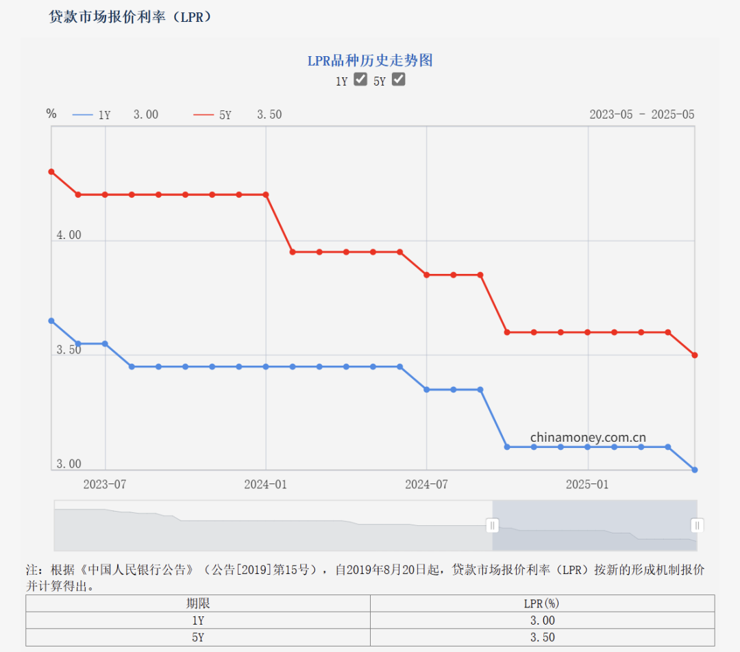 进入2025年,尽管年初国库现金定存中标利率有所下降,但3月初略有回升。近期,在降息大环境下,国库现金定存中标利率再次明显下滑。此外,5月20日,中国人民银行授权全国银行间同业拆借中心公布的贷款市场报价利率(LPR)也显示下调,1年期LPR为3.0%,5年期以上LPR为3.5%,均下调10BP。