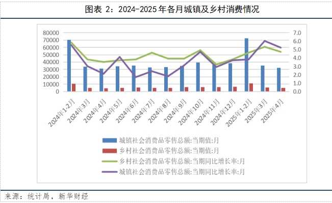 2025年4月,社会消费品零售总额同比增长5.1%,其中除汽车以外的消费品零售额增长5.6%。服务零售市场稳中有升,线上消费有所提升。政策效应继续显现,消费新动能发展壮大,但消费内生动力还需增强。