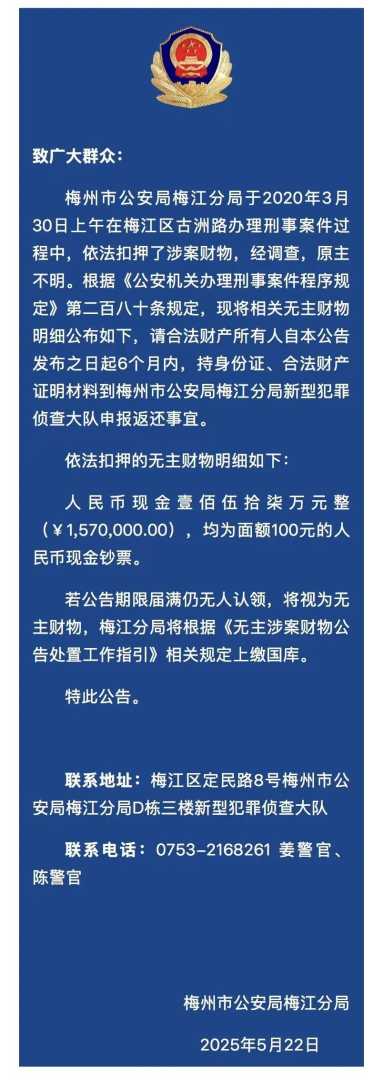 广东梅州市公安局梅江分局发布公告,依法扣押无主涉案财物157万元人民币,请合法财产所有人持相关证件到指定地点申报返还,逾期将上缴国库。