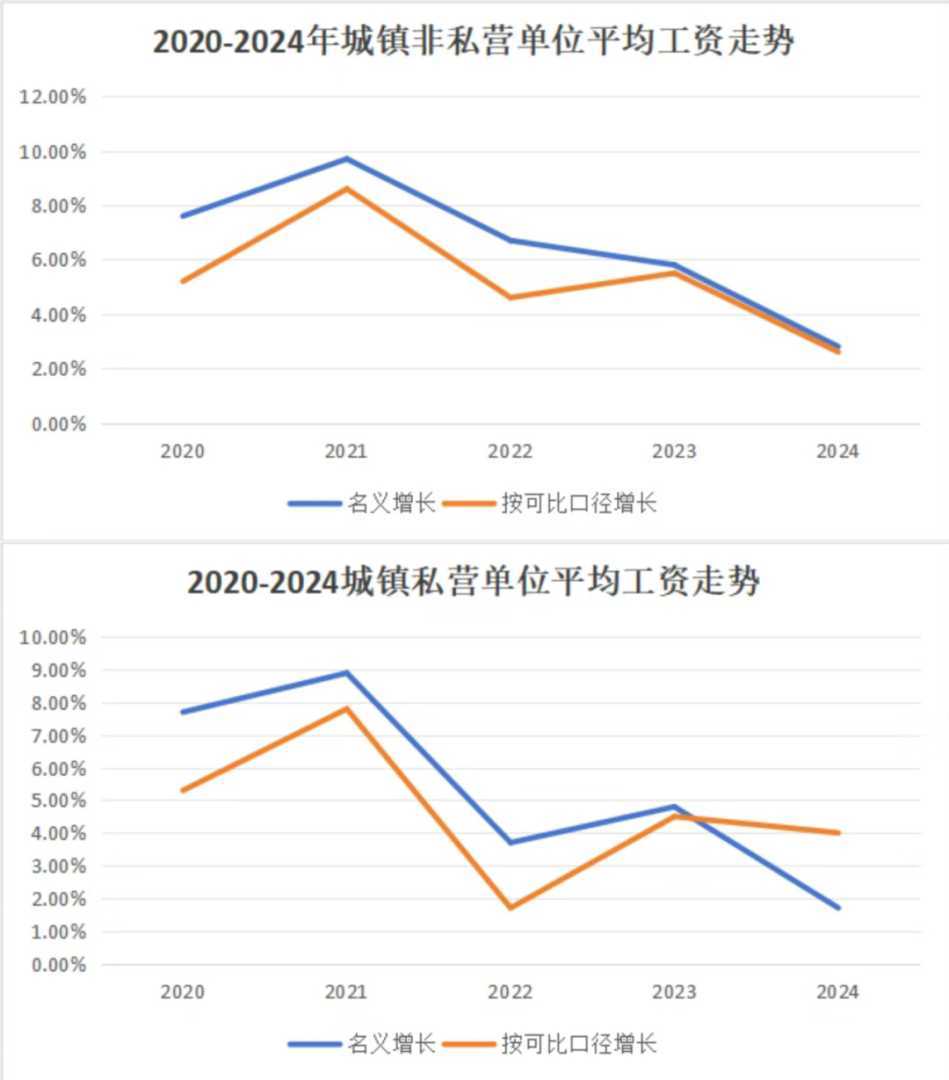 根据国家统计局数据,2024年全国城镇非私营单位就业人员年平均工资约12.4万元,名义增长2.8%;城镇私营单位就业人员年平均工资约6.9万元,名义增长1.7%。这些数据表明,虽然工资仍在增长,但增速已经放缓。