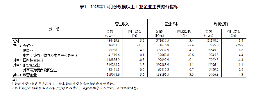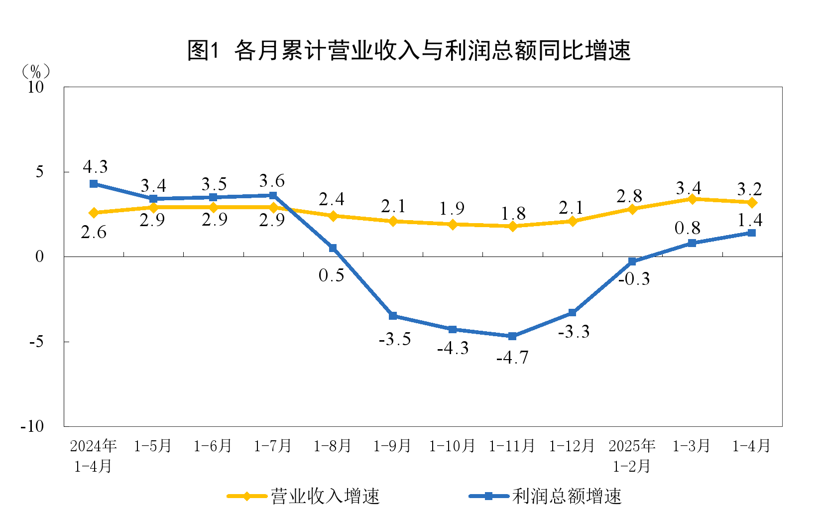 国家统计局工业司统计师于卫宁解读了2025年1—4月份工业企业利润数据。数据显示,1—4月份规模以上工业企业利润增长1.4%,较1—3月份加快0.6个百分点。