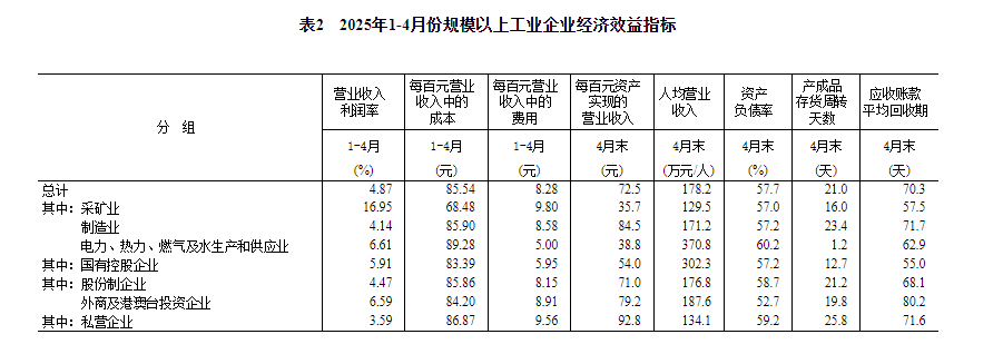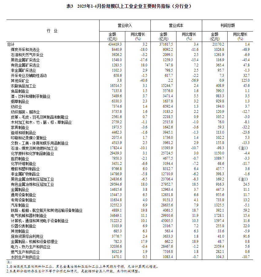 1—4月份,采矿业利润同比下降26.8%,制造业增长8.6%,电力、热力、燃气及水生产和供应业增长4.4%。各行业利润情况呈现分化,农副食品加工业增长45.6%,有色金属冶炼和压延加工业增长24.5%,而煤炭开采和洗选业下降48.9%。