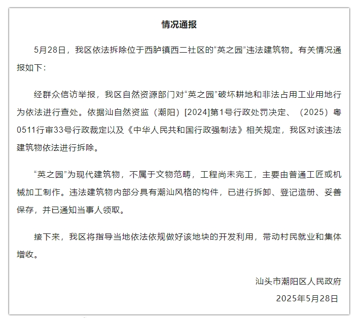 5月28日晚,汕头市潮阳区人民政府再次发布通报,明确表示“英之园”为现代建筑物,不属于文物范畴,主要由普通工匠或机械加工制作。违法建筑物内的部分潮汕风格构件已拆卸、登记造册并妥善保存。