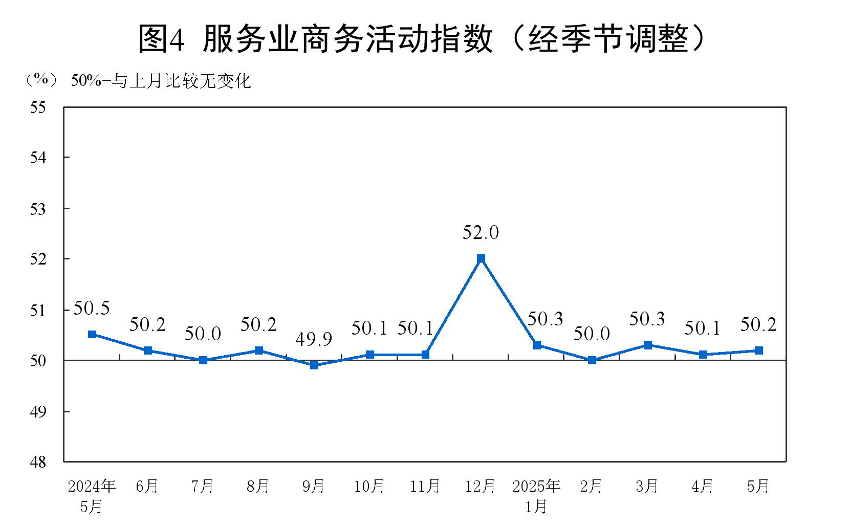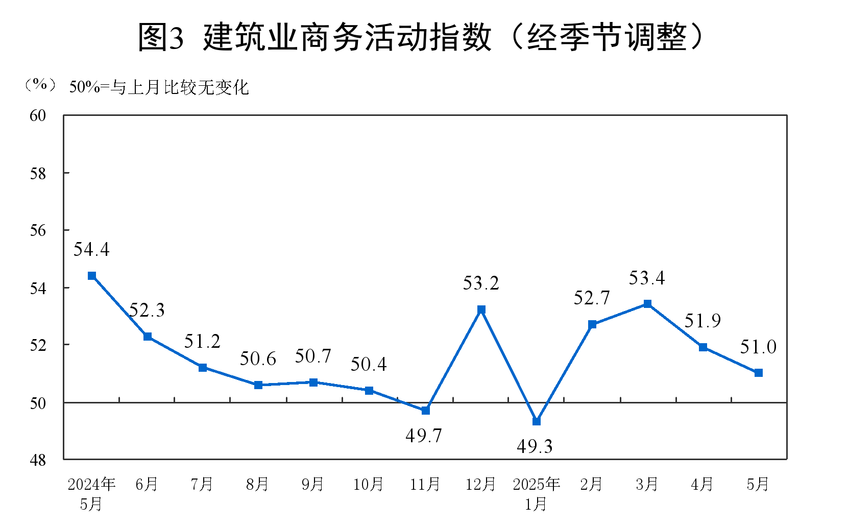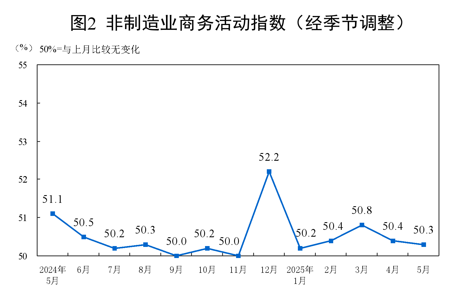 非制造业方面,5月份商务活动指数为50.3%,较上月下降0.1个百分点,但仍高于临界点,非制造业总体保持扩张态势。分行业看,建筑业和服务业均有所表现,但部分行业如房地产等仍面临挑战。