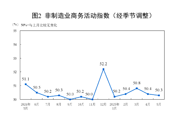 5月份,非制造业商务活动指数为50.3%,略高于临界点,非制造业总体延续扩张态势。中美日内瓦经贸会谈达成协议,基建相关海外需求和水上运输需求释放,带动行业活动回升。