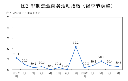 5月份,非制造业商务活动指数略降但仍高于临界点,总体延续扩张态势。