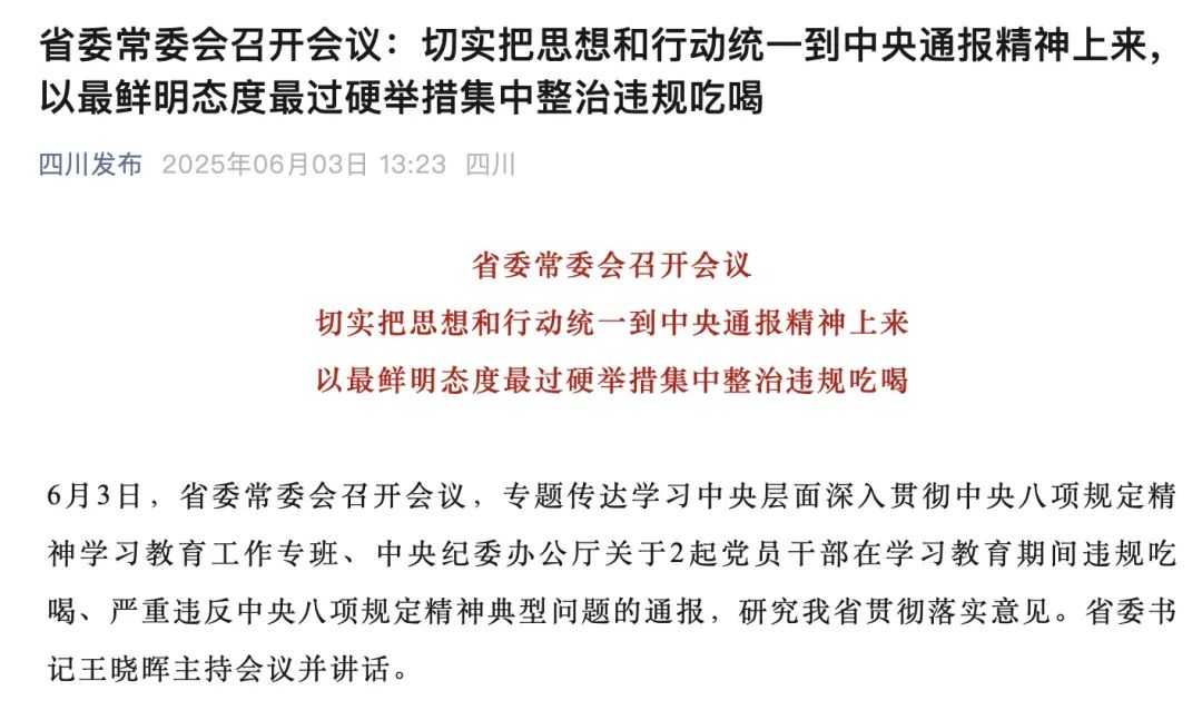 四川省委常委会也召开会议,强调要以案为鉴、警钟长鸣,坚决刹住吃喝歪风。会议指出,要加强党的作风建设,只有进行时、没有完成时,必须对违规吃喝开展集中整治,突出抓好自查自纠,强化监督检查,健全风腐同查同治工作机制。